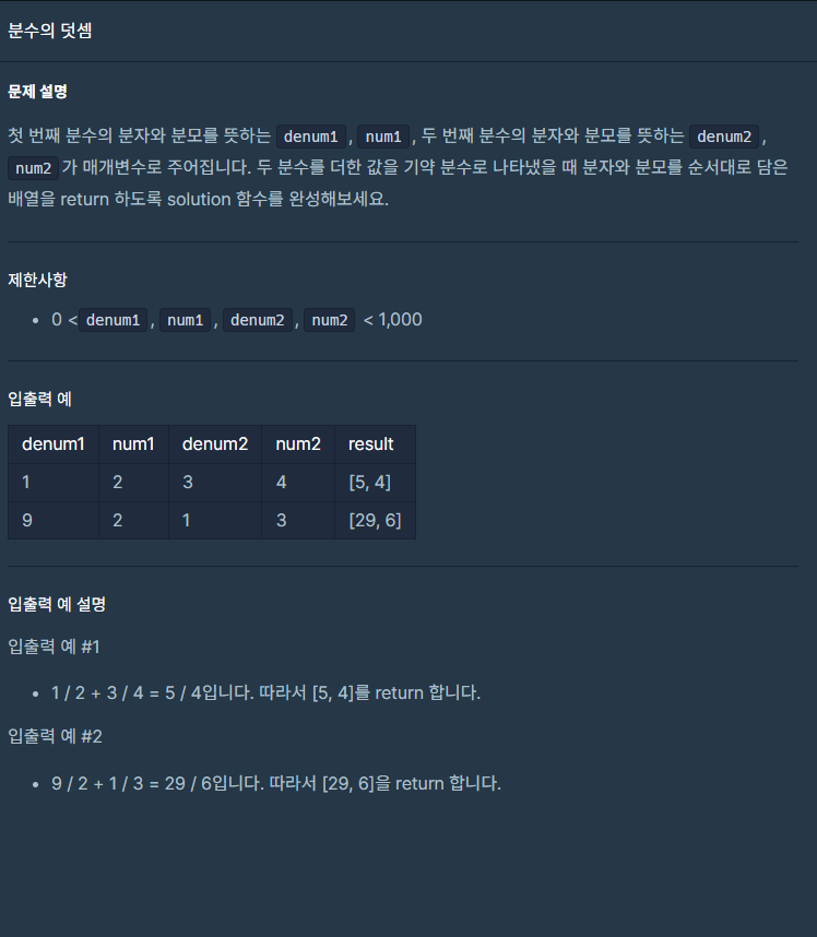 내 생각은 일단 (분모1*분자2+분모2*분모1) / 분자1*분자2 요렇게해서 나온값의 분모 분자의 공배수 로 나눈다는 생각이였다