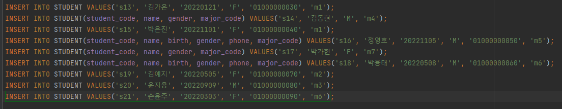 null을 허용했으면 null이 없다면 순서대로 값을 추가하면 되지만 null항목이 있다면 들어갈 항목을 VALUES앞에 명시해줘야함